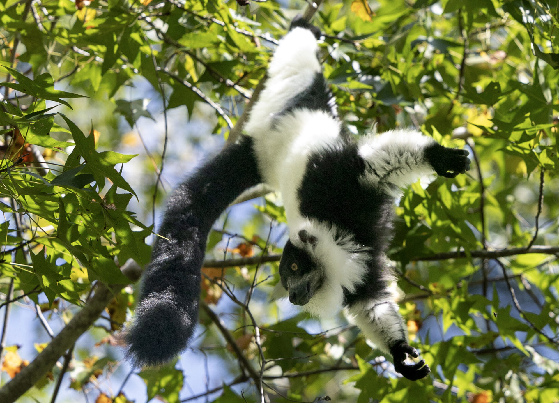 Ruffed lemurs are the largest quadrupedal lemur in Madagascar. Their bodies are around 20 inches (50 cm) long and their tails are slightly longer at around 23 inches (58 cm) which helps them balance as they move through the canopies of the rainforest.