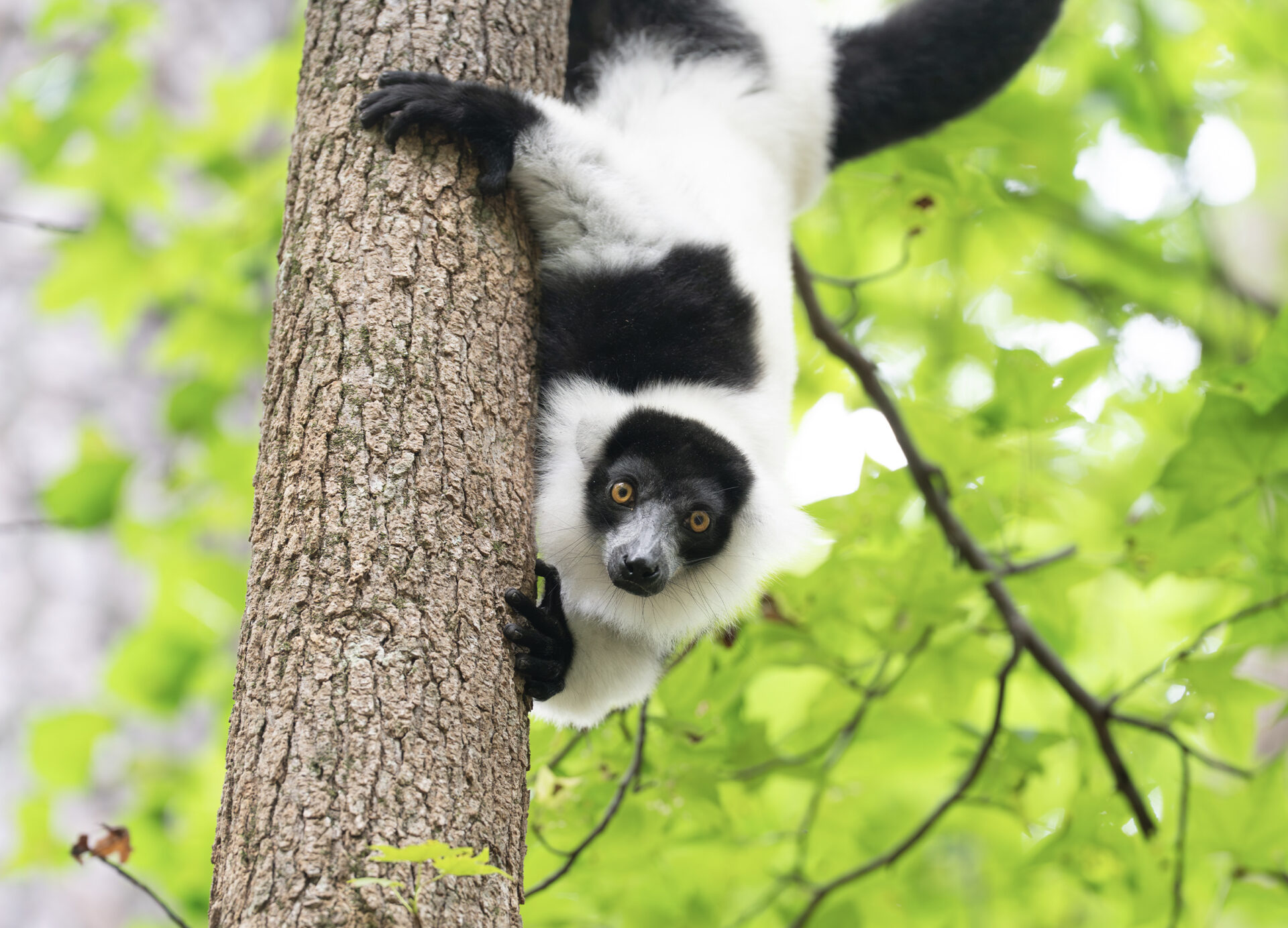 Ruffed lemurs are the largest quadrupedal lemur in Madagascar. Their bodies are around 20 inches (50 cm) long and their tails are slightly longer at around 23 inches (58 cm) which helps them balance as they move through the canopies of the rainforest.