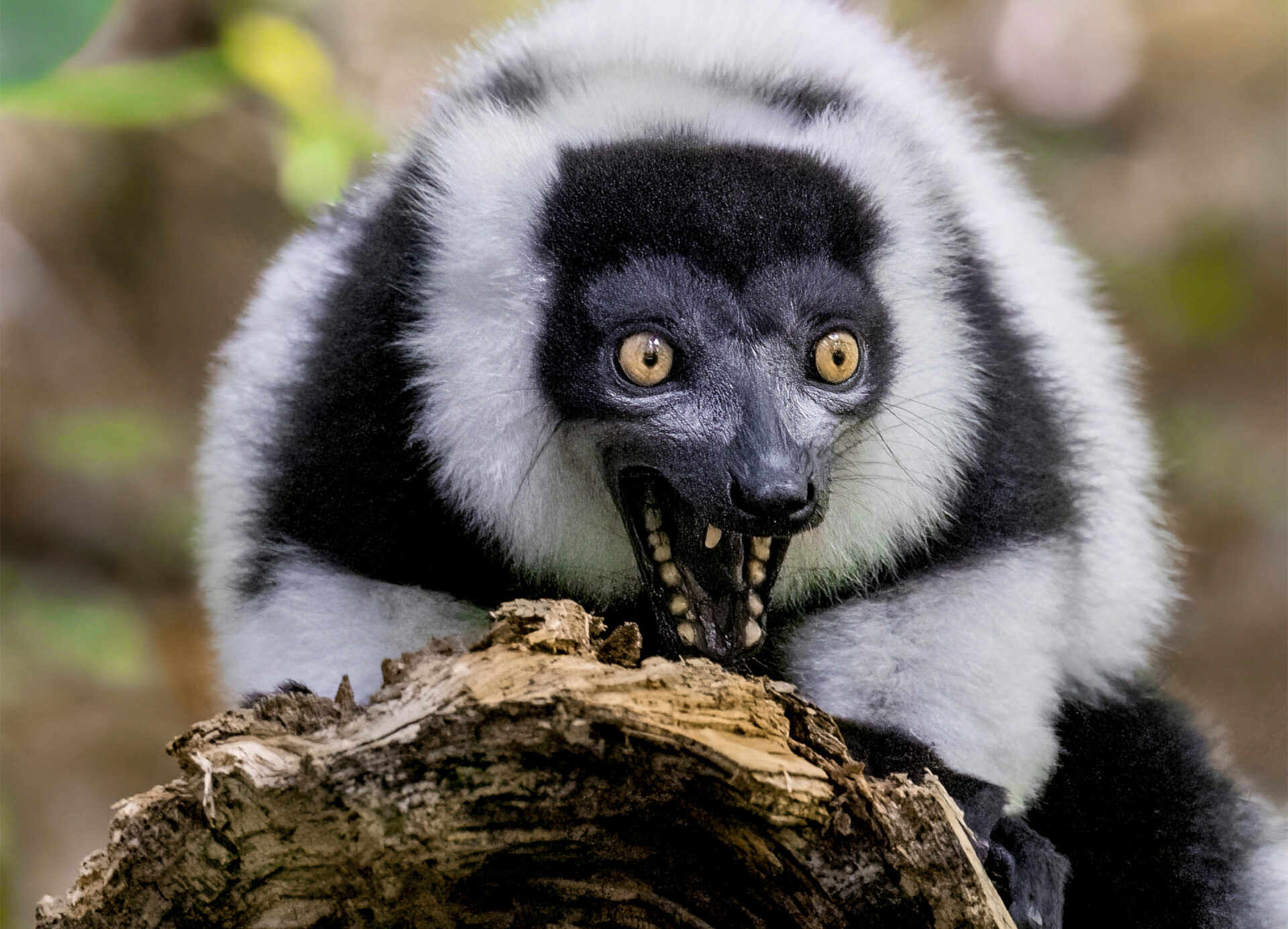 This visually striking species hails from the tropical forests of eastern Madagascar, where its thick fur is well suited to the wet, sometimes chilly environment of the rainforest canopy. Weighing up to nine pounds (4.1 kg), black and white ruffed lemurs are among the largest living lemurs and the largest pollinators in the world: as they feed, pollen sticks to the ruffs of fur around their faces and gets transported from tree to tree.