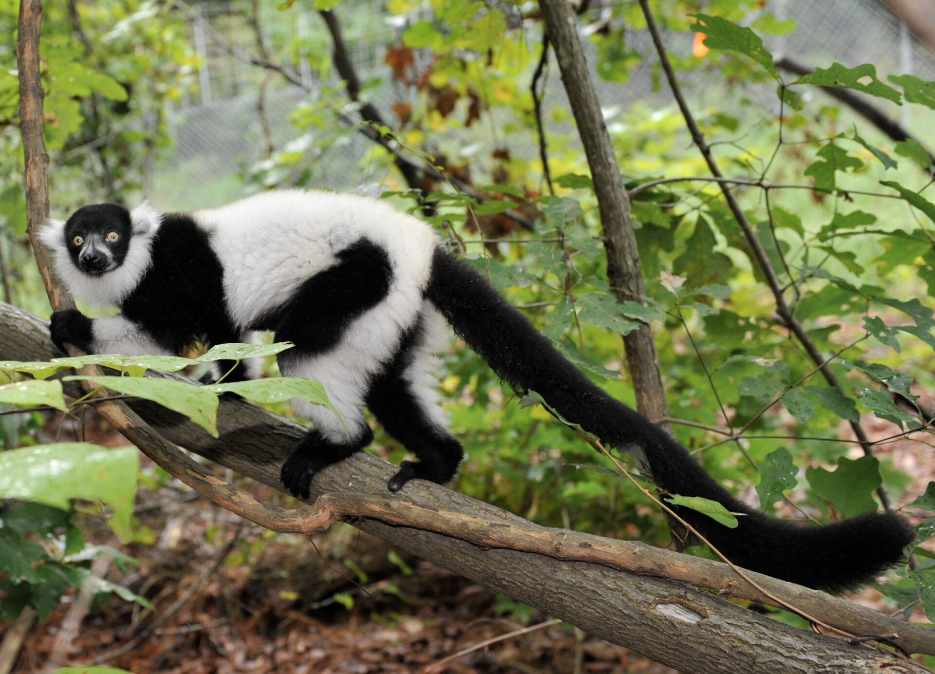 Ruffed lemurs are the largest quadrupedal lemur in Madagascar. Their bodies are around 20 inches (50 cm) long and their tails are slightly longer at around 23 inches (58 cm) which helps them balance as they move through the canopies of the rainforest.