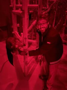 Ehsan’s enthusiasm for the aye-aye shines through his work. “If I had to focus on one topic and wasn’t allowed to do anything else, I would pick studying aye ayes. That’s it,” he says. “For the rest of my life, I can do that.” Pictured: Ehsan at the Duke Lemur Center, feeding a mealworm to an aye-aye. Photo courtesy of Ehsan Dehgan-Niri.
